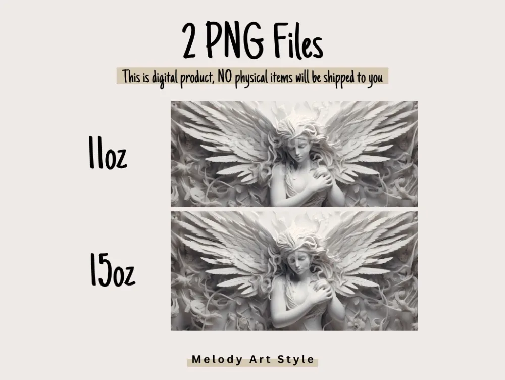 Angel Mug Wrap PNG, Mystical Monochrome Fantasy Mug Sublimation, Ethereal Winged Angel Art, Gothic Coffee Mug Print, 11oz 15oz Digital Download M201