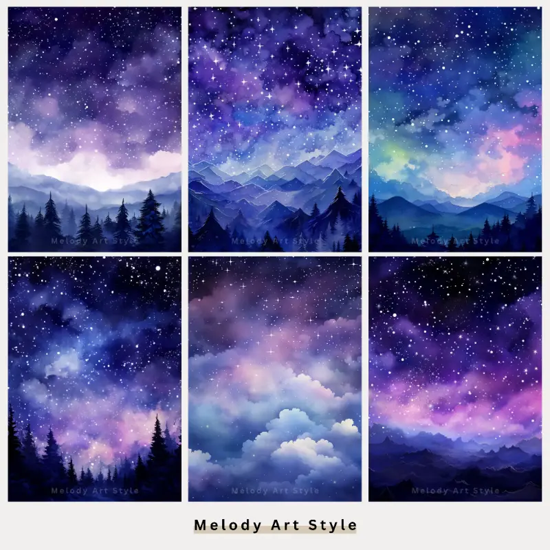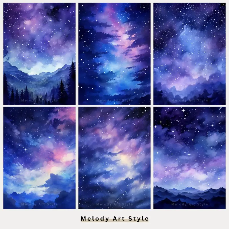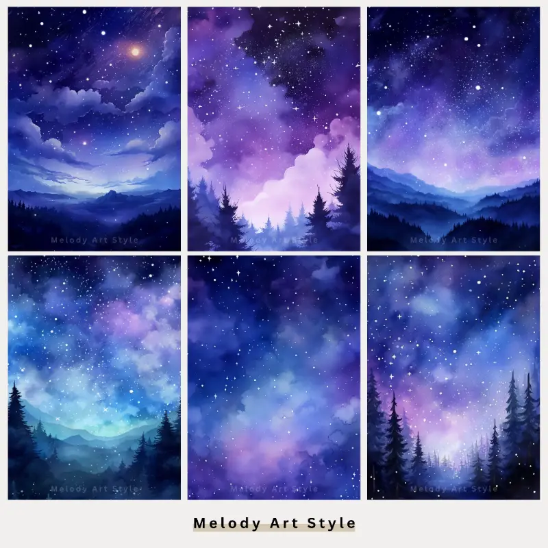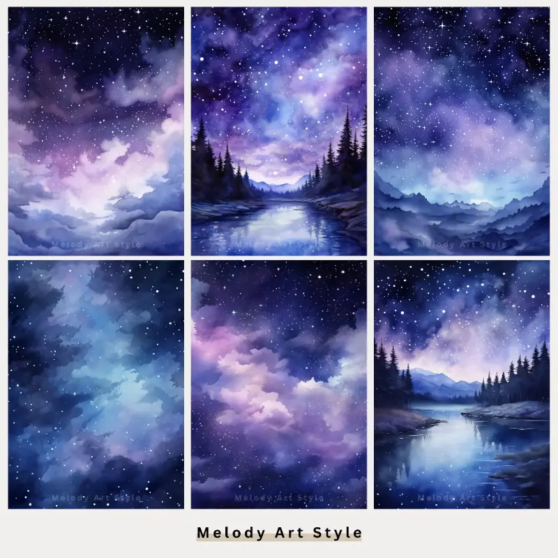Night Sky Printable Art, Watercolor Purple Night Sky Landscape Digital Paper, Junk Journal, Scrapbook, Blue and Pink Digital Download D15
