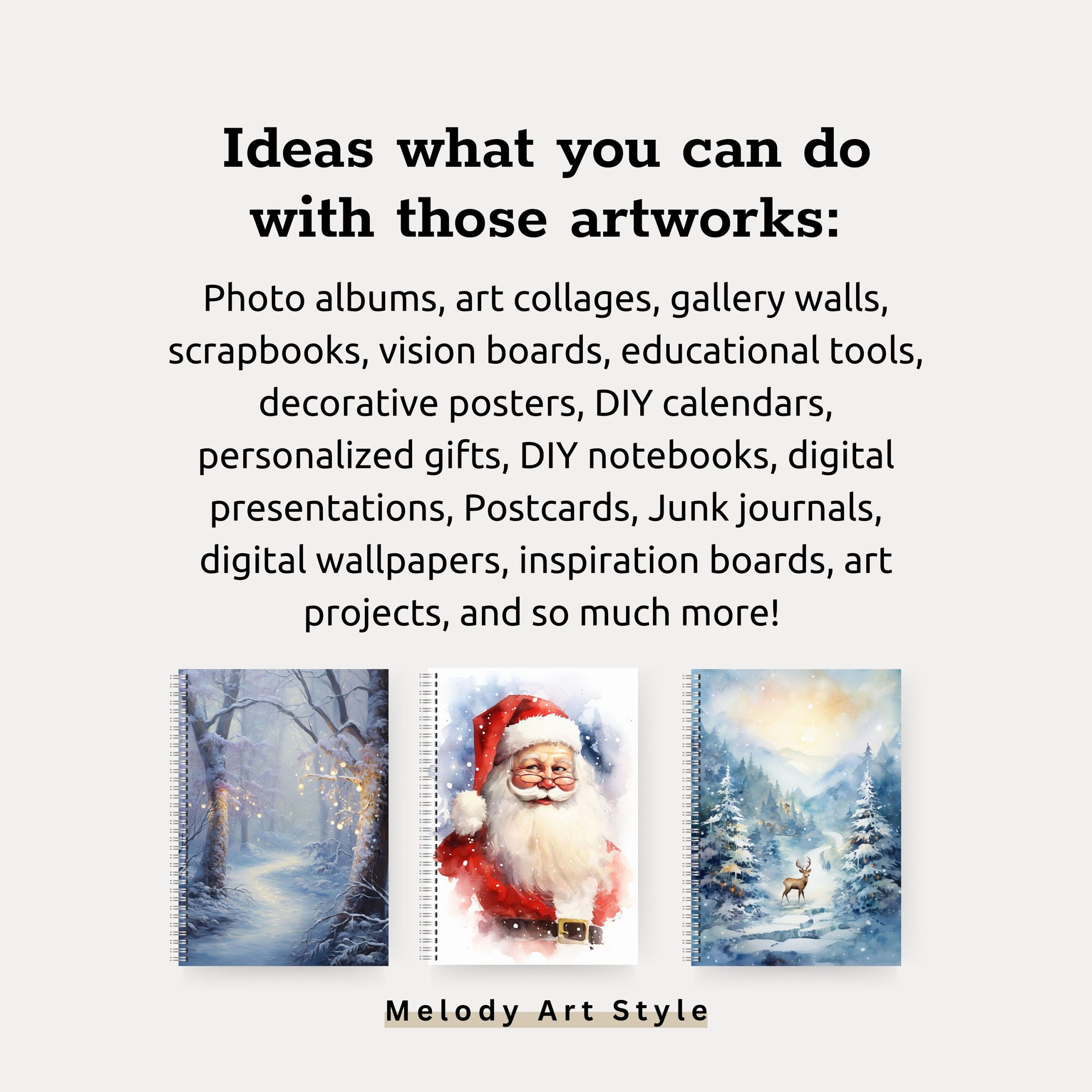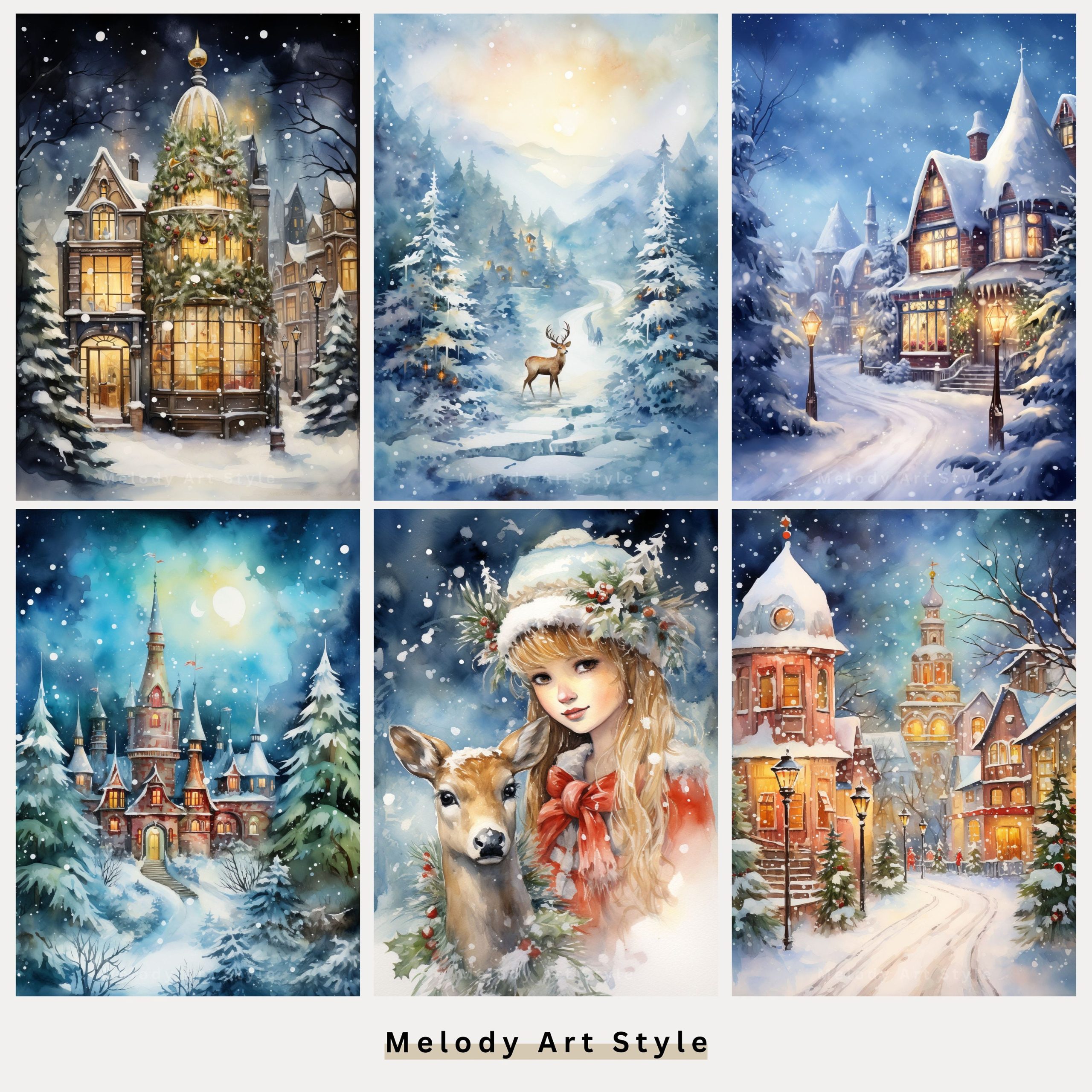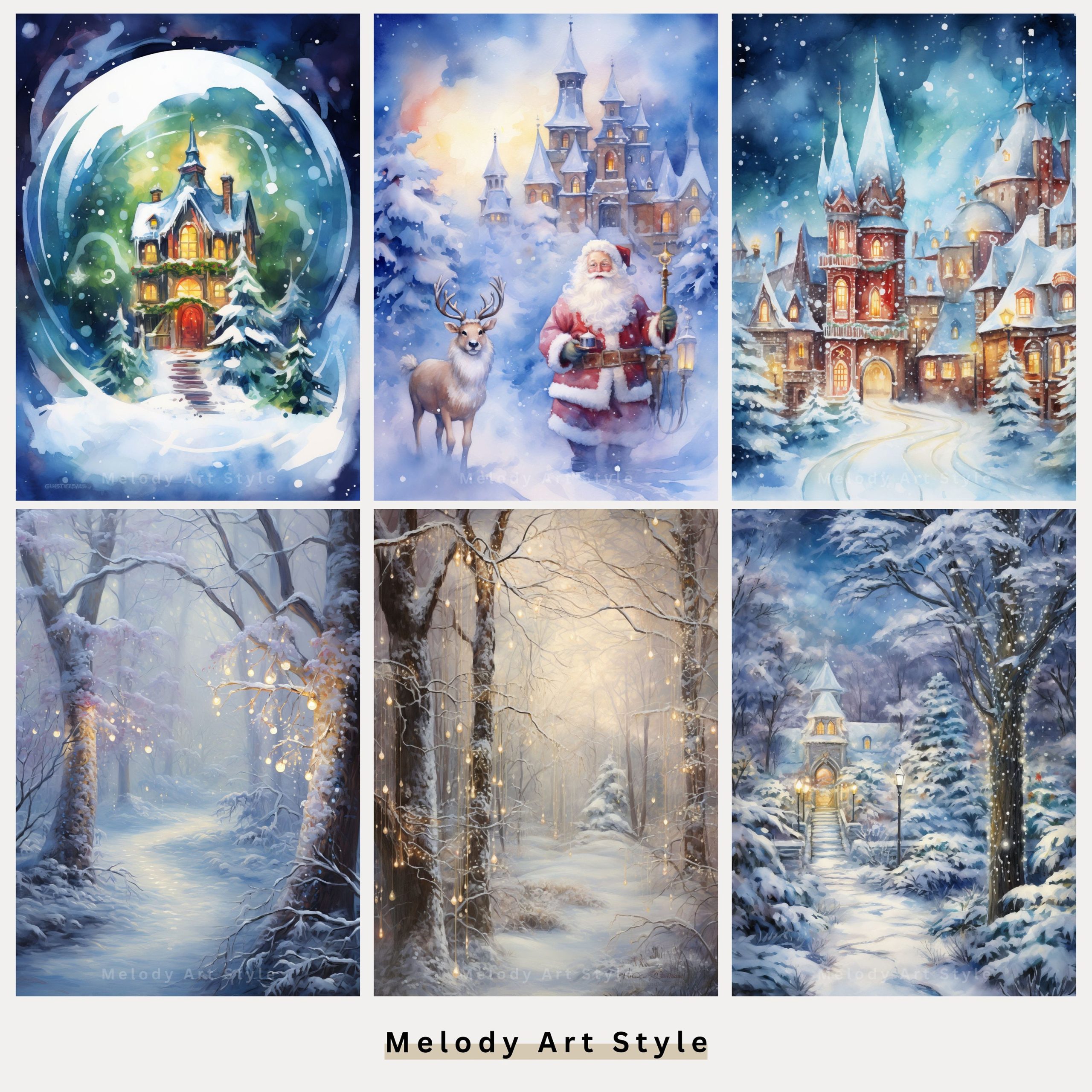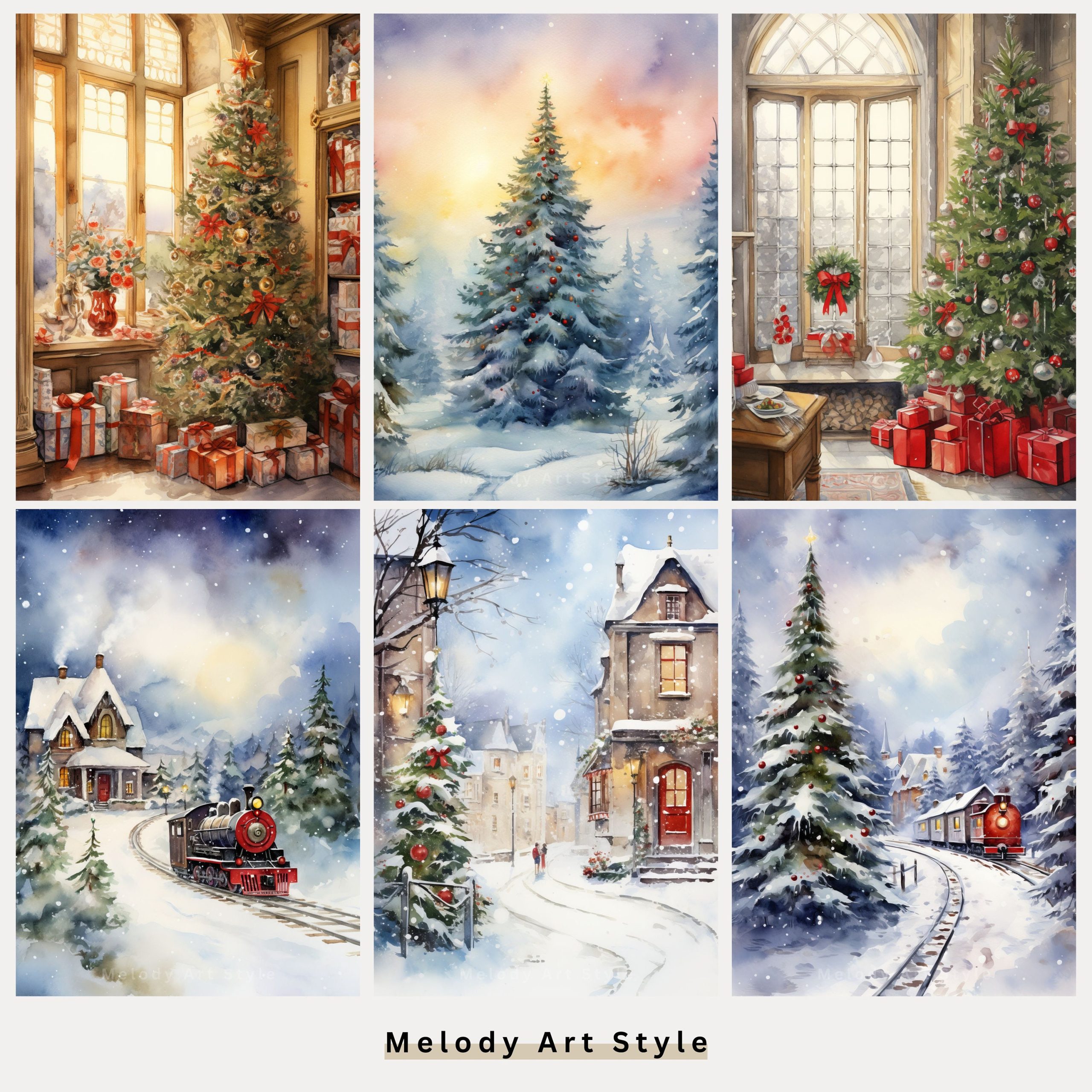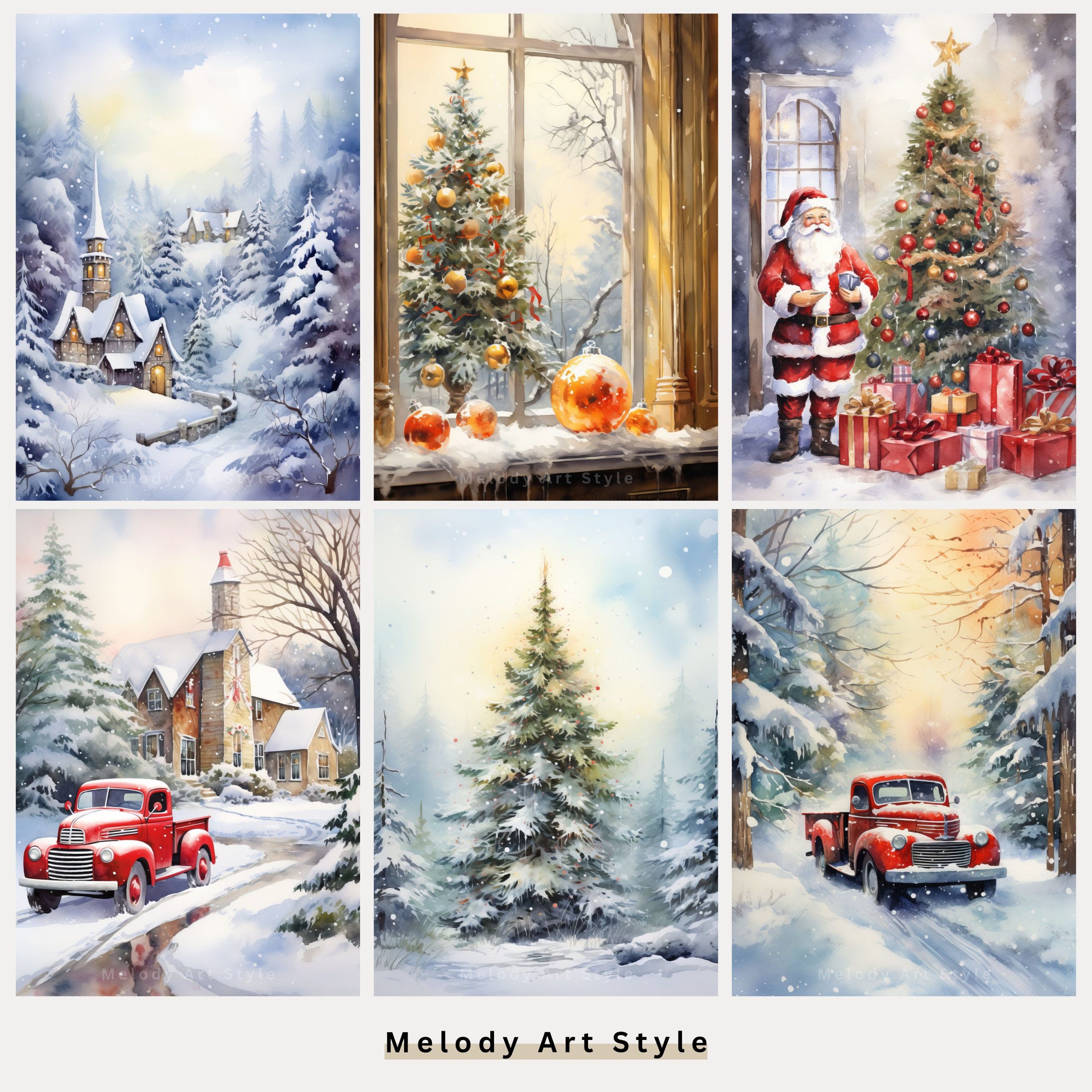 Watercolor Christmas Printable Art, Santa Claus, Christmas Tree Magical Scene Digital Paper Scrapbook, Junk Journal, Digital Download D7