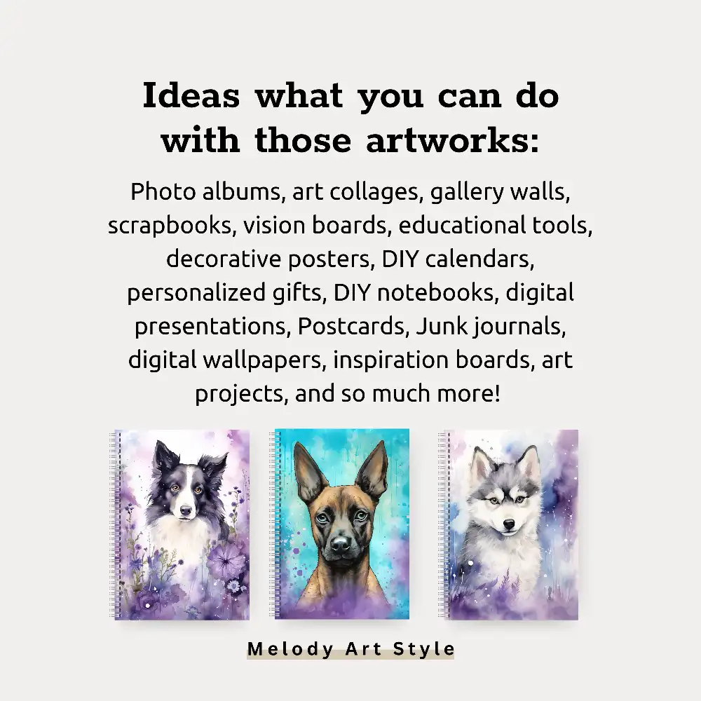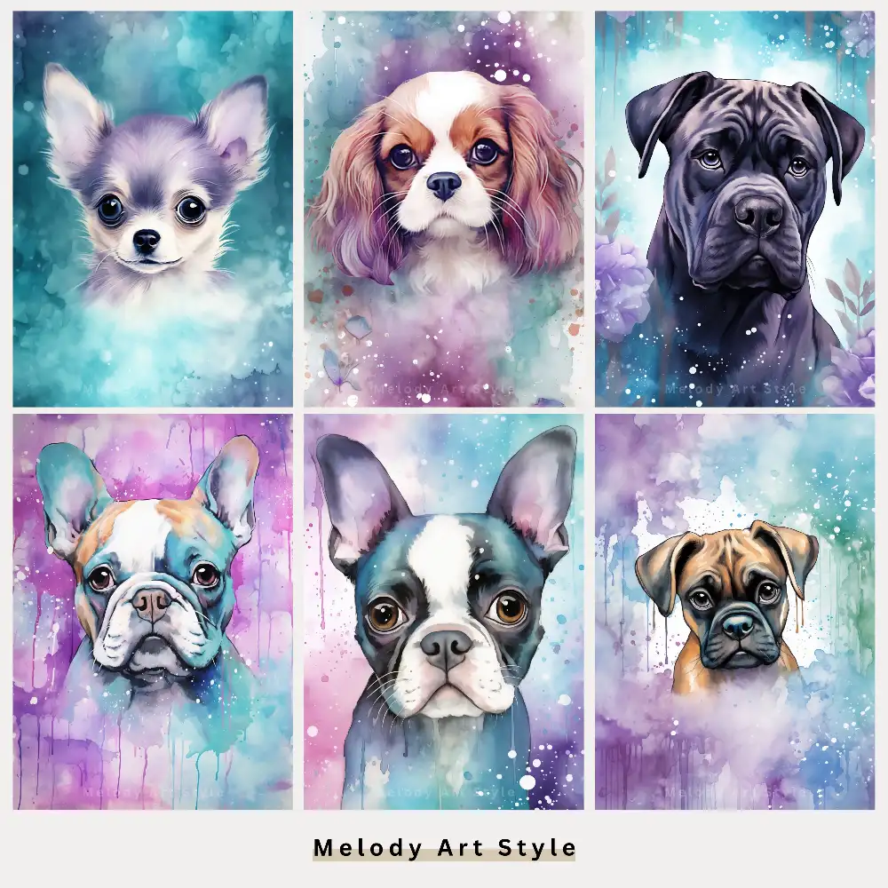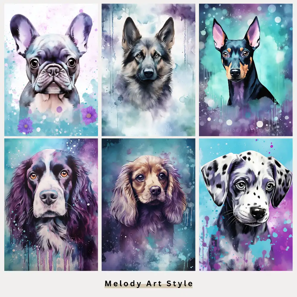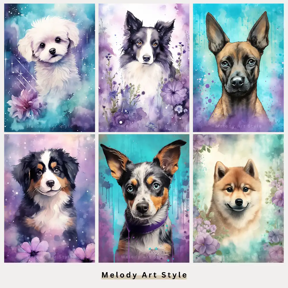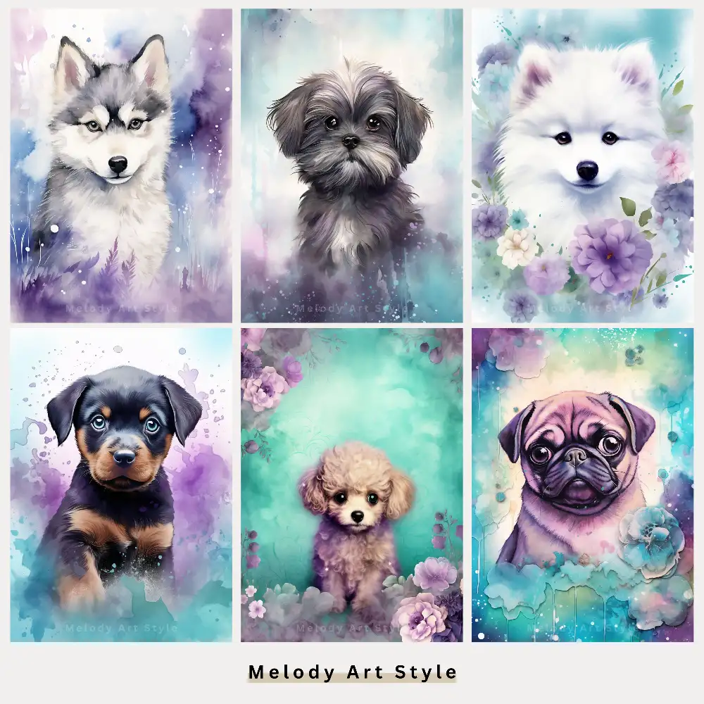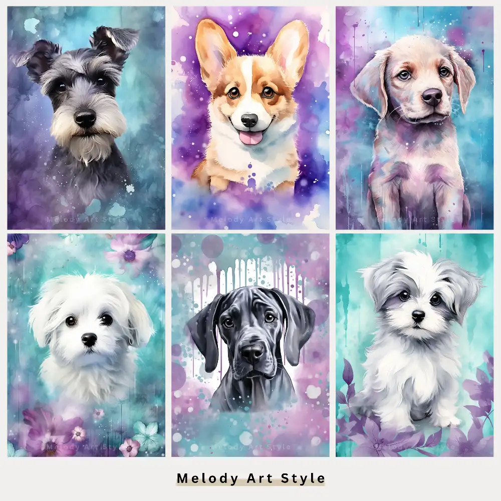 Watercolor Dog Printable Art, Purple Teal Junk Journal Puppy Printables, Cute Pet Portraits Art Scrapbooking Digital Download D162